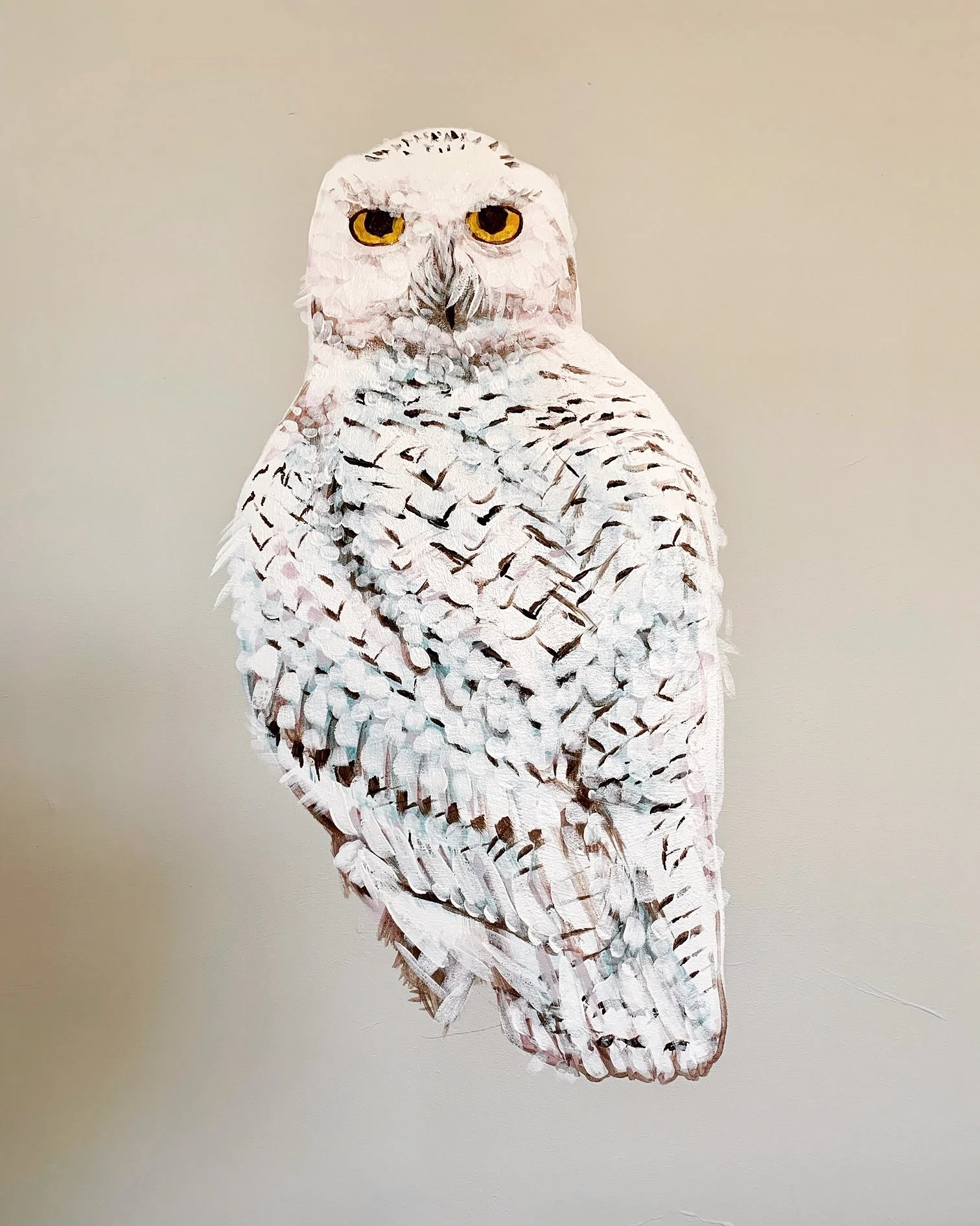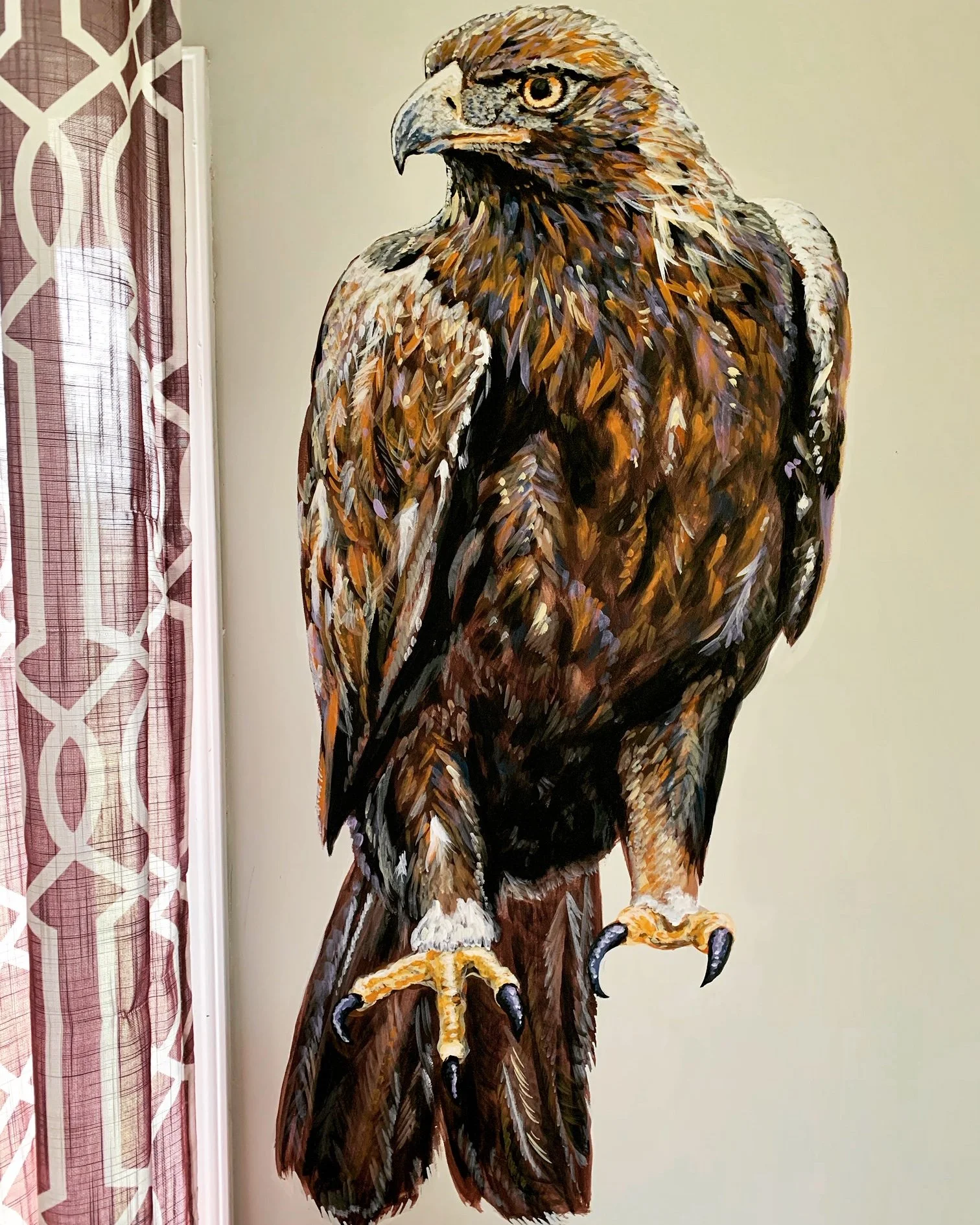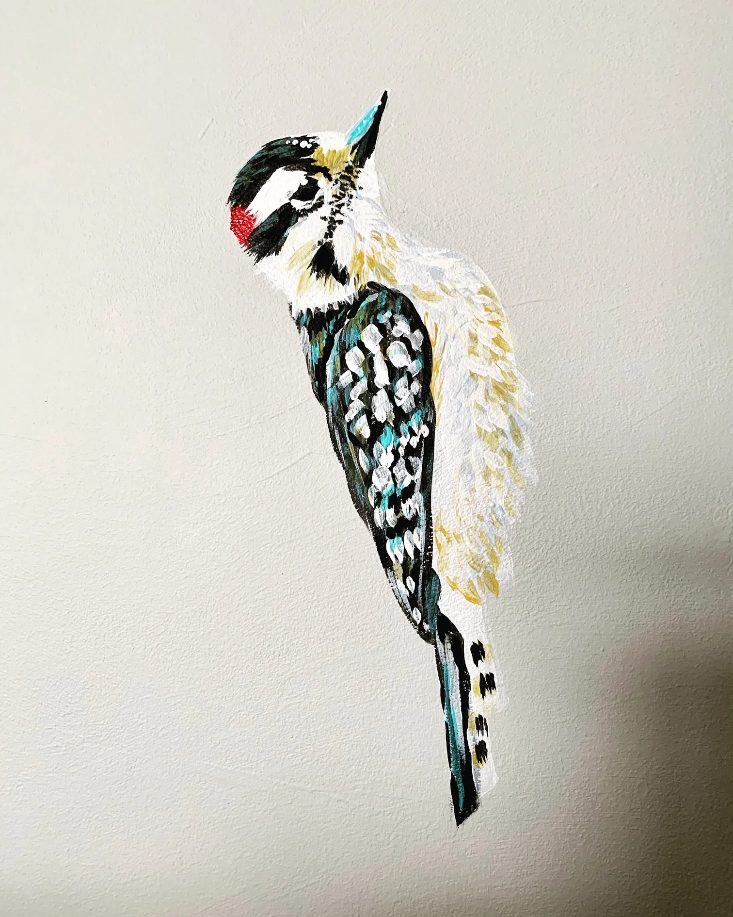 In late March, 2020 I lost my new job due to the COVID pandemic. I found myself at home and very isolated. My husband was still able to report for work out of the house at the time. It was a lonely and unsettling time. I decided I needed bite-size projects to keep myself occupied. Art supply stores were closed with online shopping only, which I decided against due to cost. I decided my living room wall would become my palette. As it was spring time, I was becoming an avid bird watcher. We live on an acreage with many grown trees and shrubs, a real attractive haven for migrating birds. I started journaling any new birds I would see visiting our yard and would paint their portrait.